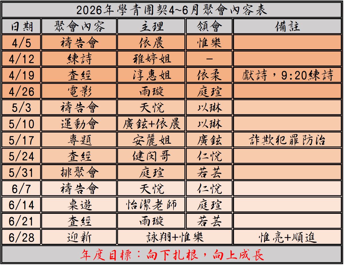2026年學青團契4~6月聚會內容表